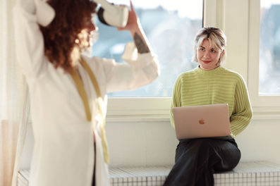 Tech and s*x: two topics which always have strived to create authenticity and up-close experiences. The promise remains: "Feel it real - experience transformation, evolution and change." But in which sociopolitical direction is this supposed progress moving? Daliah Schulte and Anna-Karina Vollmer provide insights into the transformative effect of virtual reality on pOrnOgraphy and discuss how VR technologies are redefining physicality and intimacy. Through theoretical inputs and practical VR experiences, power structures are questioned together and emancipatory possibilities of virtual realities in the discourse on s*x work are explored. The workshop concludes with a reflection on how and whether VR can serve as a tool for inclusive and consensual sexuality.